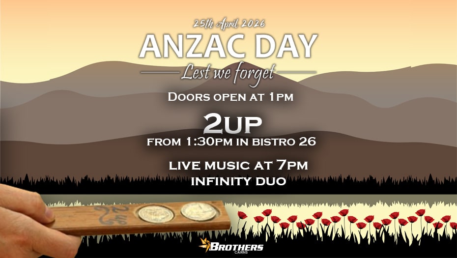 Join us this Anzac day to commemorate and celebrate our service people past and present. Doors open – 1pm2UP from 1.30pm in Bistro26Food – 1pm-9pm in Fratelli’sLive music – 7pm Infinity Duo Lest we forget